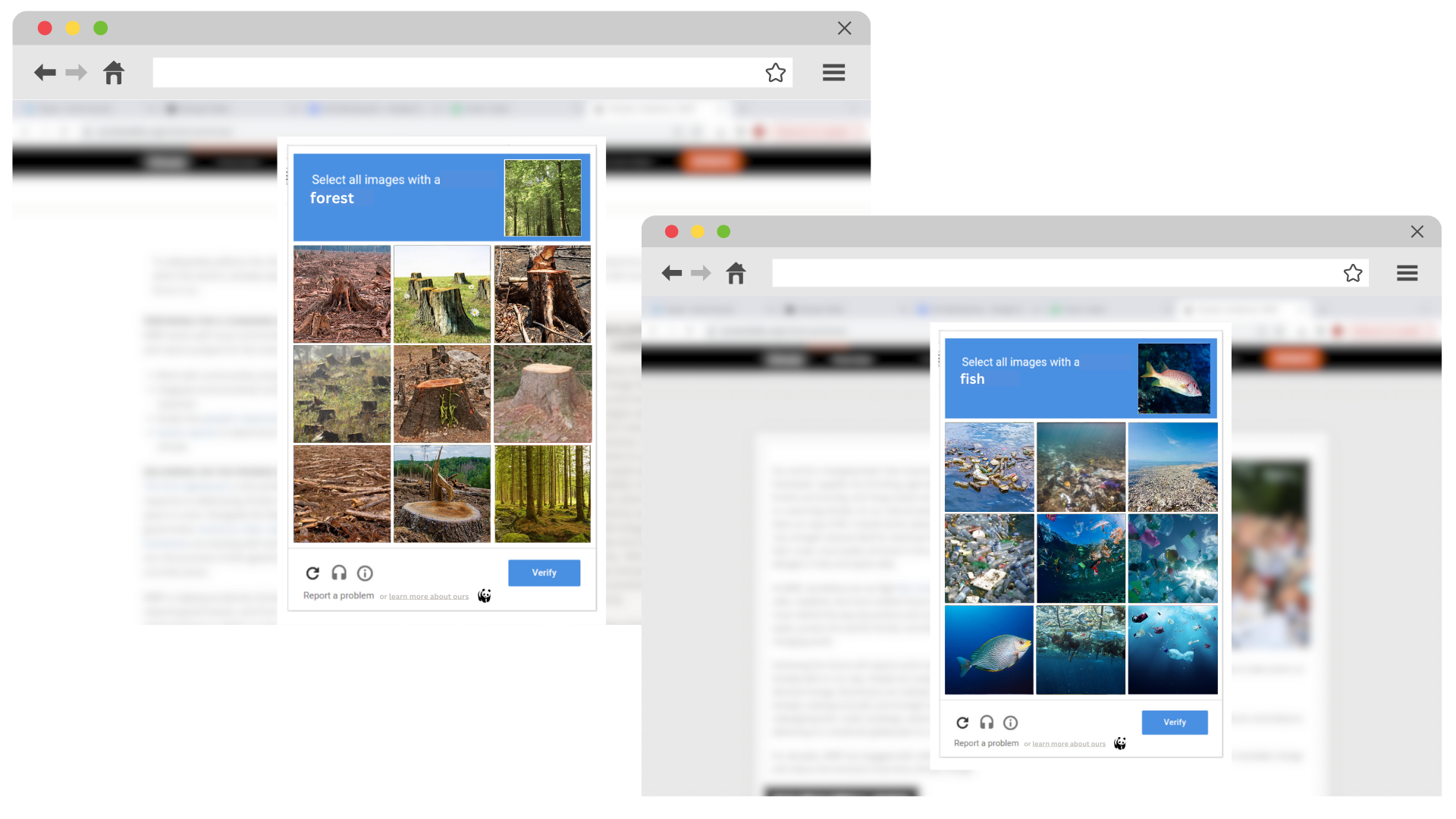 Partnering with Google for the social aspect of our campaign in which users have to play an active role in identifying the issues. Incorrect answers result in having to watch an un-skippable 30s video on the climate crisis — because Google ReCAPTCHA proves your human but caring about climate change proves your humanity.
